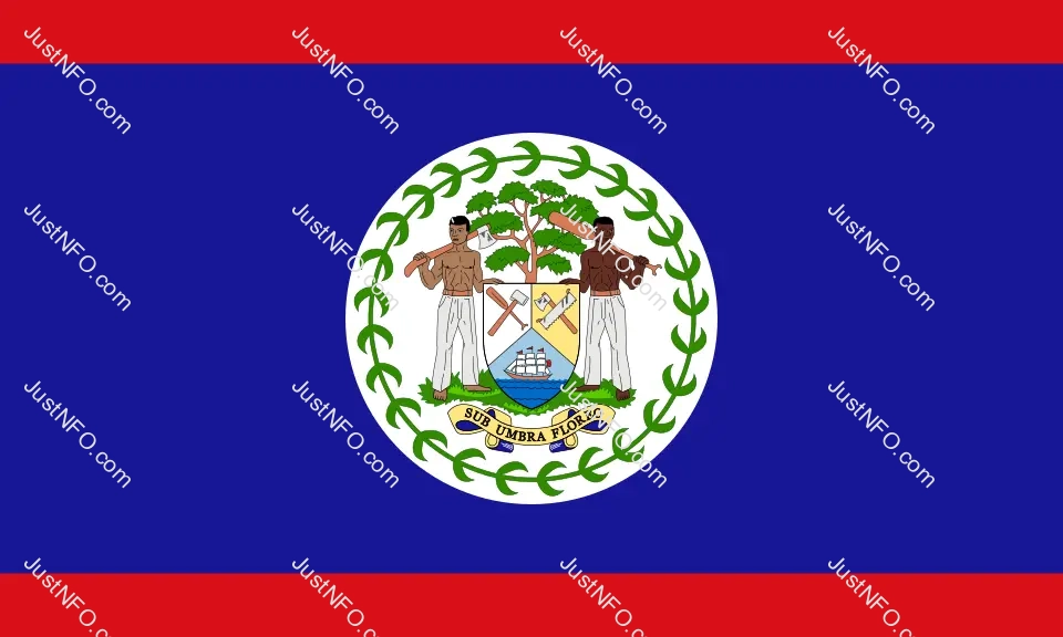 The Flag of Belize with blue and red stripes and the national coat of arms featuring two woodcutters
