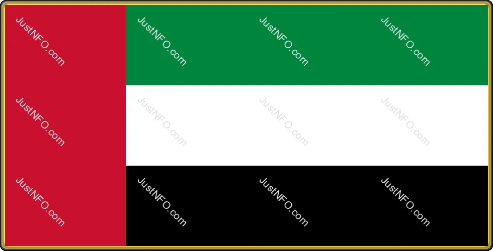 The official flag of the United Arab Emirates featuring four Pan-Arab colors: red, green, white, and black. It consists of a vertical red band on the hoist side and three horizontal stripes of green, white, and black, symbolizing unity, strength, prosperity, and Arab identity.