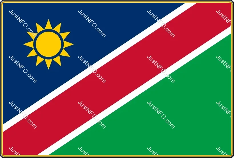 The official flag of Namibia with diagonally divided sections in blue, red, and green, featuring a golden twelve-point sun on the blue field, symbolizing vitality, sunshine, and the country’s natural richness