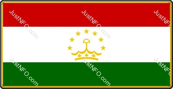 The flag of Tajikistan is a tricolor of red, white, and green, with a gold crown and seven stars in the middle of the white stripe.